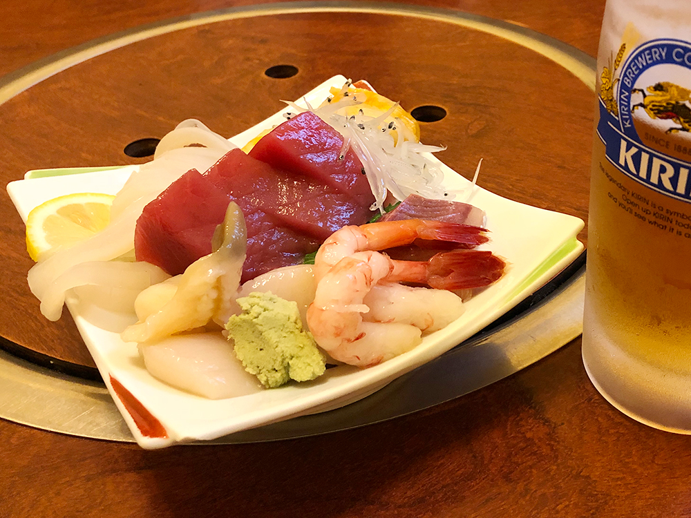 とりあえずビールですが。てんこ盛りの刺し盛り。